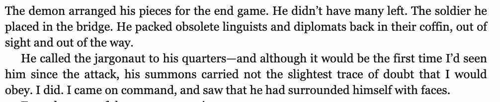 Her claim that Sarasti’s actions were without purpose is the equivalent of Achamian, upon being ambushed by the Scarlet Spires in the Sareötic Library, crying, “Think on this, Eleäzaras!” He fails the infamous crayon-box test (not for the first time), failing to model the situation from Eleäzaras’s perspective. Since it is, after all, Achamian for whom this situation is a surprise, Achamian who needs to think about it. Eleäzaras has clearly spent days if not weeks plotting this ambush, and had more than ample time to think through the costs and benefits. The same goes for Bates telling Sarasti his actions had no purpose – just because you don’t know the purpose, doesn’t mean there is none, it just means you haven’t thought about it enough yet.