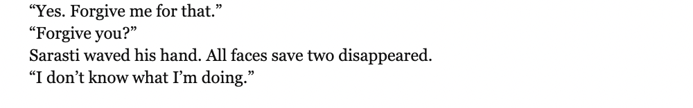 Good question. You have to realize, it’s a very different scenario. Sarasti is much closer in level to Kellhus, maybe even above him, so he can’t be modeled the same way as a level five like Cnaiür. No, you have to assume everything Sarasti does is for a purpose. That is, to understand his motive, we should take Eliezer Yudkowsky’s advice, and assume the actual effected result was what was intended.